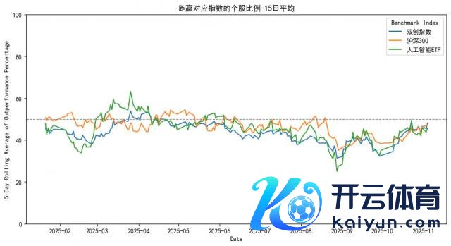 我用近 5000 只沪深 A 股的个股数据和 3 个指数作念了比较,算了下能跑赢三个指数的个股比例。成果很彰着,进入下半年牛市以来,惟有不到一半的个股能跑赢这些指数,到斜率陡峻时,一度不到四成。
