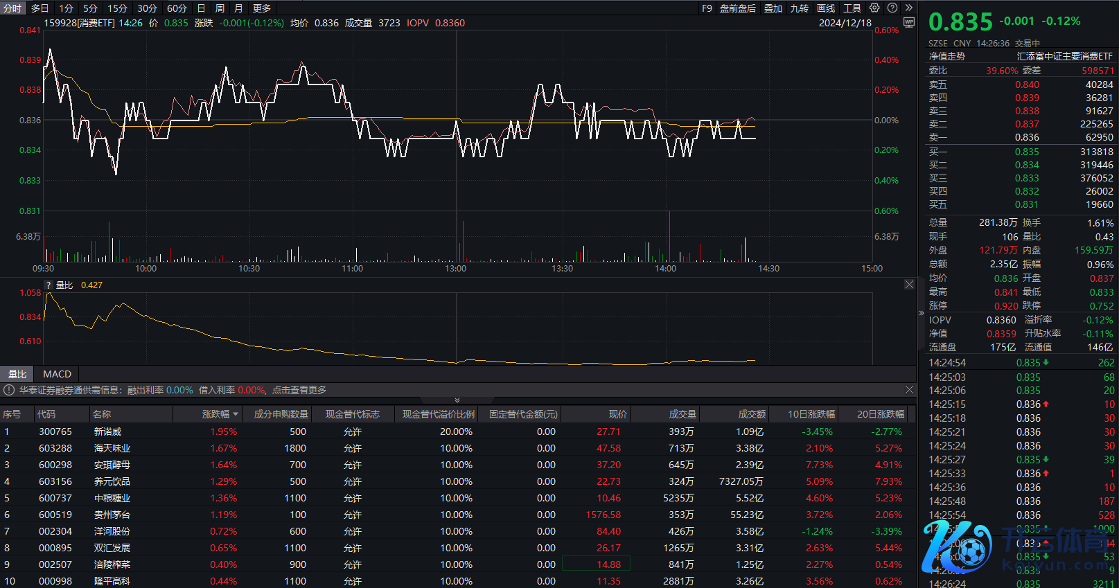 相关ETF方面,甘休发稿,消耗ETF(159928)微跌0.12%,因素股方面,新诺威涨1.95%,海天味业、安琪酵母等多股涨超1%。