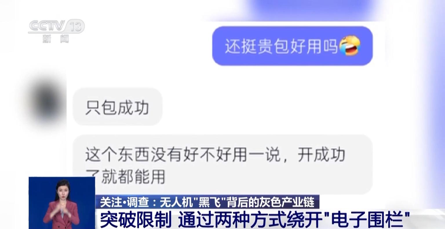 在一家视频平台上,一个卖家暗示,惟有付费900块钱,就不错解开无东说念主机内限飞和限高的配置,并暗示,惟有买了他们的软件,电子围栏就不再起作用,而况包得胜。在另一个卖家的账号里,记者看到,明晰地写着“无视禁飞区”“禁飞区也不错飞”的字样。